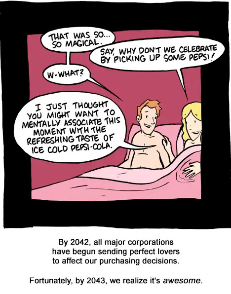 I have to say the AI crowd understands this well, that the killer ability of AIs is their ability to engage, not what they know. This cartoon (which I’m sorry to say I can’t track the origin of…) captures a scenario of AIs creating dream companions for us all. Just with a bit of commercial sponsorship thrown in…