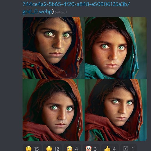 How often does Stable Diffusion produce copies? The Somepalli paper, cited above, looking for very similar images between training data and output found them in Stable Diffusion about 2% of the time. When does a model produce copies? Sometimes it happens when particular, relatively unique combinations of words are very tightly associated with a oft-repeated single image in the training set. In such cases the results might be highly influenced by that single image, to the extent that prompts with the right key words will yield only a slightly varied copy of that image. Karla Ortiz managed to get copies of Steve McCurry’s Afghan Girl from Midjourney V4 (based on Stable Diffusion) for example.